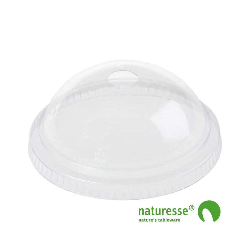 Låg PLA kuppel m hul til Ø76mm. Låget er med rundt hul til sugerør etc. Disse låg er helt glas klare. På grund af PLA's egenskaber er de kun egnet til kolde fødevarer. - Yderligere information