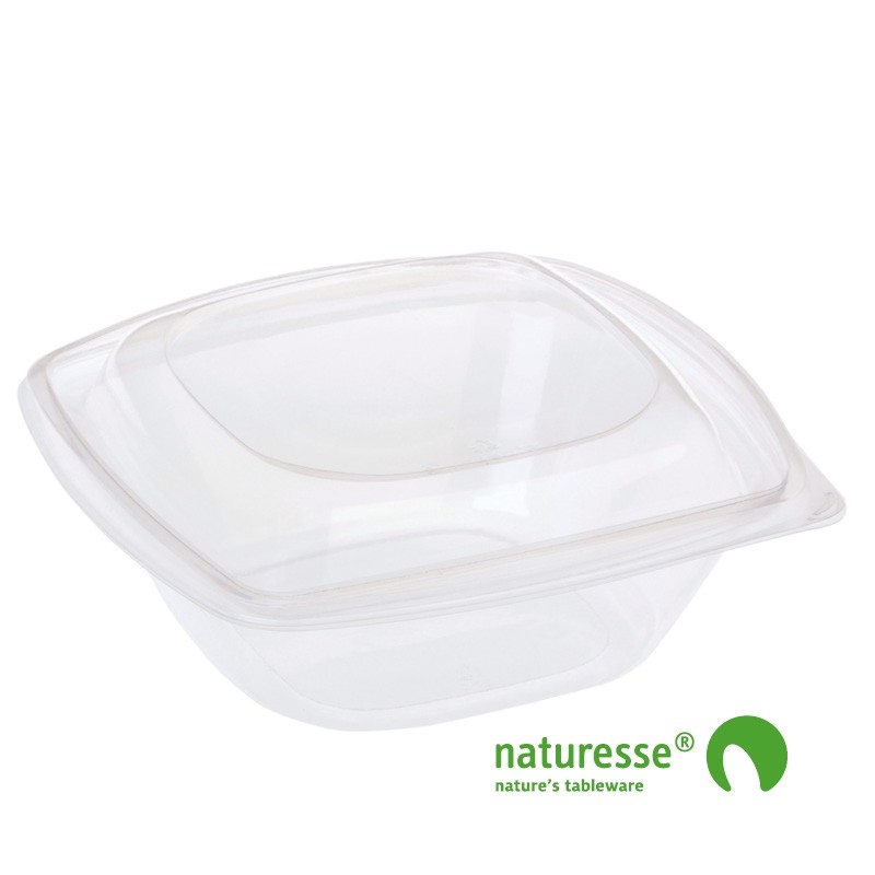PLA salatskål 960ml inklusiv låg. Skålen måler 192x192x78mm, Disse skåle er helt transparente og på grund af PLA's egenskaber kun egnet til kolde fødevarer. Er certificeret komposterbar i henhold til DIN EN 13432 (DIN CERTCO) Skål m låg 960ml i klar PLA