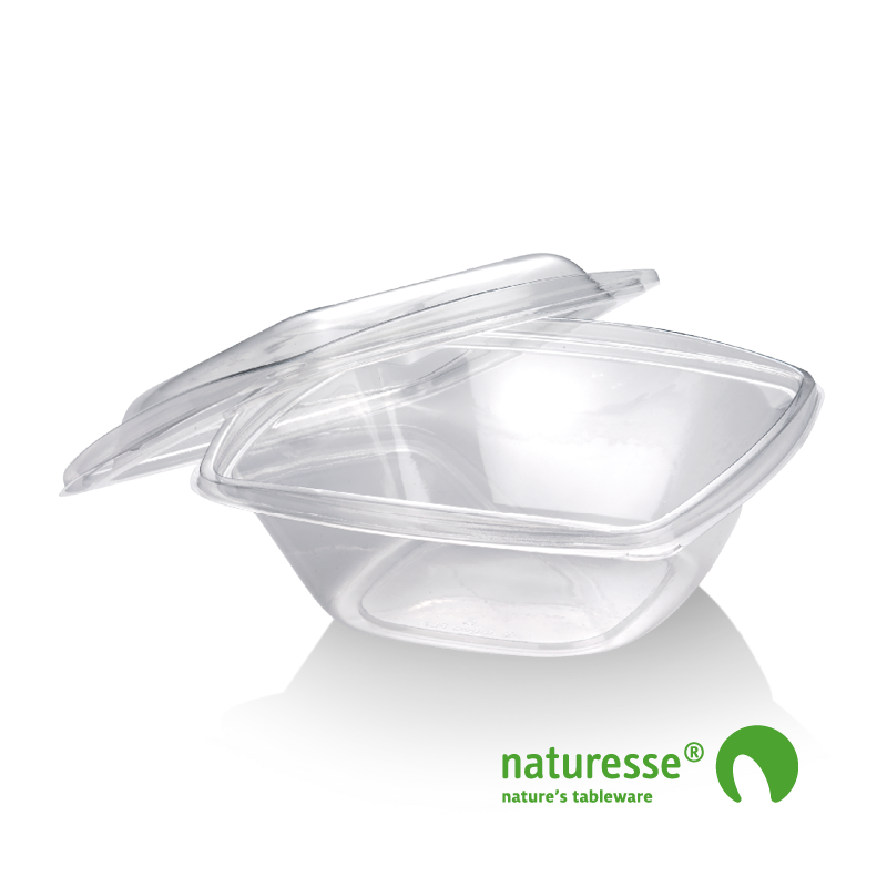 PLA salatskål 960ml inklusiv låg. Skålen måler 192x192x78mm, Disse skåle er helt transparente og på grund af PLA's egenskaber kun egnet til kolde fødevarer. Er certificeret komposterbar i henhold til DIN EN 13432 (DIN CERTCO) Skål m låg 960ml i klar PLA - Yderligere information